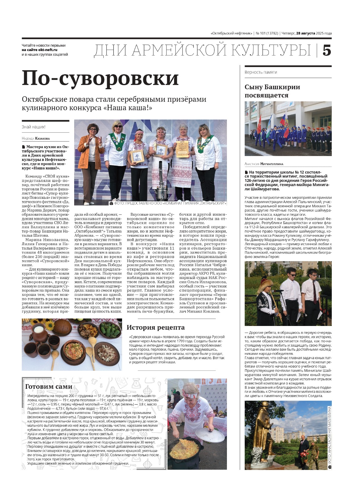 Наша команда приготовила знаменитую «Суворовскую» кашу, вкусовые качества которой оценили не только компетентное жюри, но и жители города Нефтекамск – 48 килограмм (более 250 порций) было роздано во время народной дегустации.